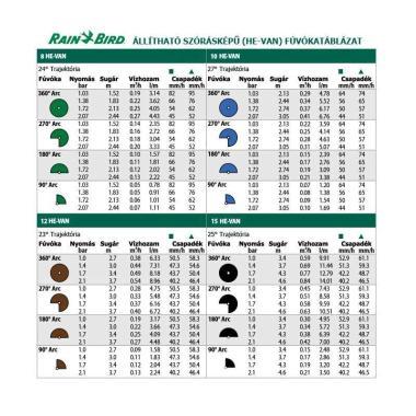 A Rain Bird HE-VAN fúvókák a professzionális öntözés megtestesítői. Speciális kialakításának köszönhetően még a szórófejhez közeli részeken sem hagy száraz foltokat. A nagy vízcseppek ellenállnak a szélnek és a párolgásnak, ezért nincs feleslegesen kijuttatott víz. A HE-VAN spray fúvókák nyújtják a legnagyobb egyenletességet és lefedettséget a spray fúvókák közül, ennek köszönhetően akár 35%-kal csökkenhet az öntözés időtartama. A Rain Bird HE-VAN-15 spray fúvóka öntözési sugara 3,4-4,6 méter, szögtartománya pedig 0-360°. Minden spray fúvóka egyedi színkóddal van ellátva, ezekből a színekből kideríthető a fúvóka sugara és szögtartománya, ami egy esetleges csere esetén nagyon megkönnyíti a választást. Minden szögtartományban használható, öntözhetünk vele hegyesszöget, tompaszöget, de az íves területekkel is megbirkózik. A spray fúvókáknál fontos, hogy a szórófejkiosztásnál meglegyen a megfelelő átfedés. Minden szórófejet öntözzön meg legalább egy szomszédja. A fúvókához tartozik egy kis méretű szűrő.