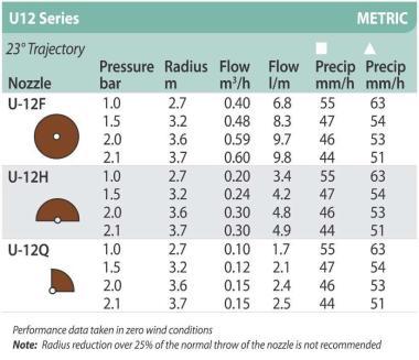 A Rain Bird spray fúvókák kiválóak a kis és közepes kertek gazdaságos öntözéséhez. A Rain Bird U-12H spray fúvóka öntözési sugara 2,7-3,7 méter, szögtartománya pedig fix 180°. Egyedi kialakításának köszönhetően még a szórófejhez közeli részeken sem hagy száraz foltokat. A víz egyszerre két nyíláson át távozik, egy a közeli, egy pedig a távolabbi területek öntözését látja el. Minden spray fúvóka egyedi színkóddal van ellátva, ezekből a színekből kideríthető a fúvóka sugara, ami egy esetleges csere esetén nagyon megkönnyíti a választást. A spray fúvókáknál fontos, hogy a szórófejkiosztásnál meglegyen a megfelelő átfedés. Minden szórófejet öntözzön meg legalább egy szomszédja. A fúvókához tartozik egy kis méretű szűrő.