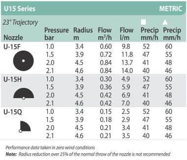 A Rain Bird spray fúvókák kiválóak a kis és közepes kertek gazdaságos öntözéséhez. A Rain Bird U-15F spray fúvóka öntözési sugara 3,4-4,6 méter, szögtartománya pedig fix 360°. Egyedi kialakításának köszönhetően még a szórófejhez közeli részeken sem hagy száraz foltokat. A víz egyszerre két nyíláson át távozik, egy a közeli, egy pedig a távolabbi területek öntözését látja el. Minden spray fúvóka egyedi színkóddal van ellátva, ezekből a színekből kideríthető a fúvóka sugara, ami egy esetleges csere esetén nagyon megkönnyíti a választást. A spray fúvókáknál fontos, hogy a szórófejkiosztásnál meglegyen a megfelelő átfedés. Minden szórófejet öntözzön meg legalább egy szomszédja. A fúvókához tartozik egy kis méretű szűrő.